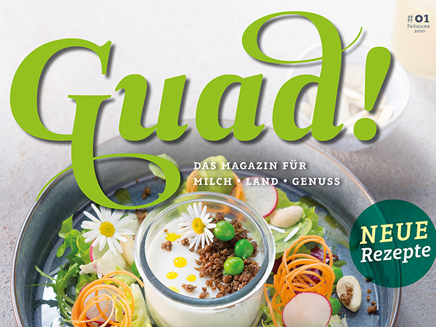 Der Verband der Milcherzeuger Bayern veröffentlicht ab 2020 ein regelmäßig erscheinendes Magazin für Milch, Land und Genuss. Das Heft richtet sich an Verbraucher/innen und wird dreimal pro Jahr aufgelegt. Es liefert Einblicke in die Landwirtschaft und die Arbeit der Milcherzeugern in Bayern und zu aktuellen Milch-Themen. Daneben gibt es Tipps von bayerischen Landfrauen und Rezepte – natürlich mit Milchprodukten! Außerdem findet man Wissenswertes und Terminhinweise auf Veranstaltungen, bei denen die Verbraucher direkt in den Dialog mit den Erzeugern treten können. Das GUAD!-Magazin wird kostenlos bei Verbraucherveranstaltungen mit vielen Besuchern wie z.B. Bauernmarktmeilen oder Tag des offenen Hofes sowie über die VMB-Milchreferentinnen bei Kochkursen und über verschiedene andere Multiplikatoren und Hofläden verteilt. Wer die köstlichen und raffinierten Rezepte aus dem GUAD!-Magazin nachkochen möchte, findet auf www.milcherzeugerverband-bayern.de unter Rezepte mit Milch & Käse zahlreiche Rezepte, die sich praktischerweise nach Milchprodukten sowie Kategorie sortieren lassen.