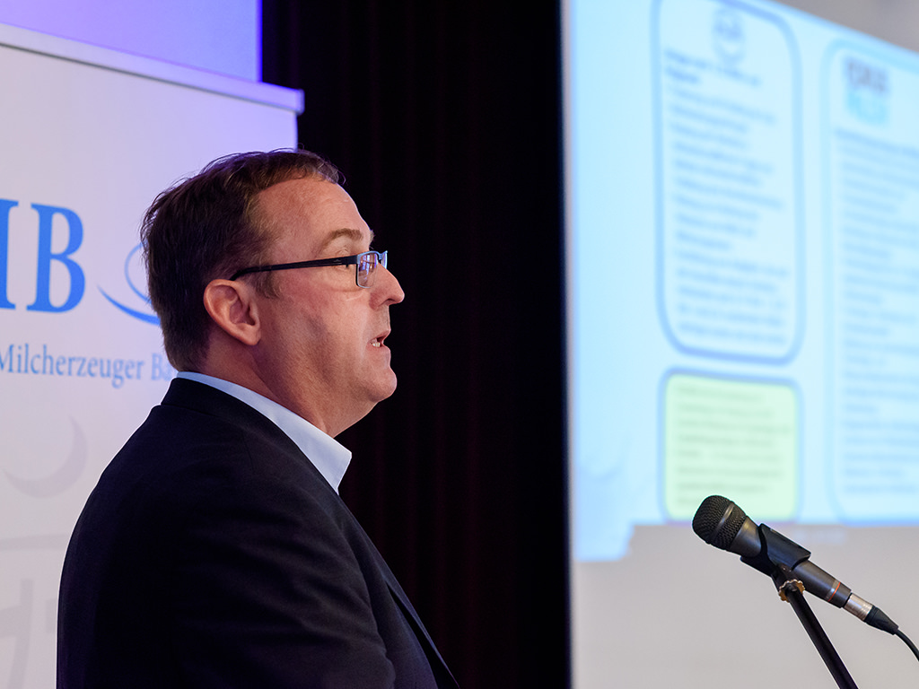 In seinem Referat stellte Frank Feuerriegel zunächst die Landesvereinigung der Milchwirtschaft Niedersachsen und Fokus Milch GmbH vor. Danach erklärte er die Struktur der Milchwirtschaft in Niedersachsen und deren aktuelle Herausforderungen, wie die Zukunft der Moorstandorte Niedersachsens, die Kälberinitiative Niedersachsen, die Klimaplattform Milch. Er gab den bayerischen Milcherzeuger:innen mit seinen Ausführungen tiefen Einblick in die Arbeit der Niedersachsen und viel Inspiration. Darüber hinaus stellte er die Kooperation mit der Landesvereinigung der Milchwirtschaft in NRW über DIALOG MILCH vor sowie weitere Kooperationen mit GML, Initiative Milch und FML. Die anschließenden Fragen aus dem Publikum brachten eine rege Diskussion in Gang, wie weit Bayern hier im Vergleich zu Niedersachsen ist.