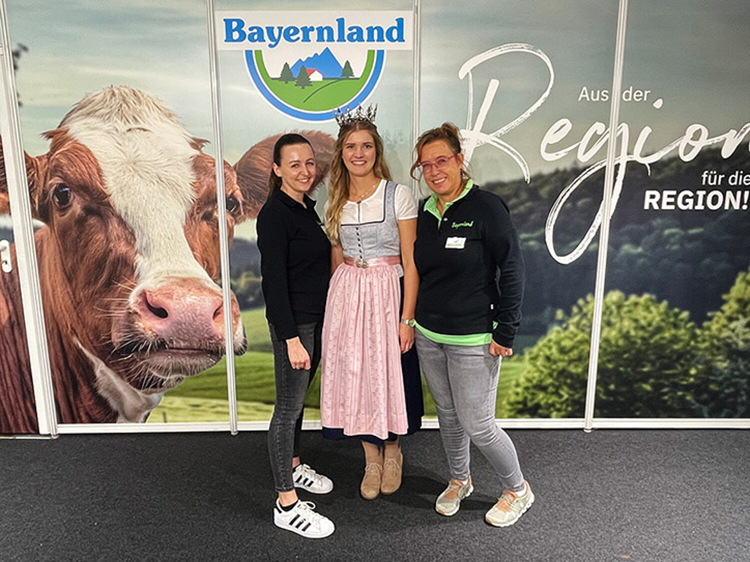 Bild unten: Die Bayerische Milchkönigin Veronika Gschoßmann am Stand der Molkerei Bayernland eG mit Marketingleiterin Julia Edmaier (links) und Kollegin (rechts).