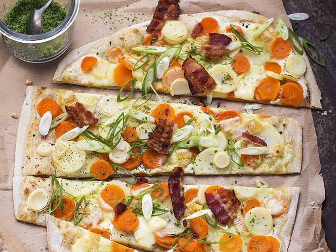 Flammkuchen mit Wurzelgemüse und Limburger
