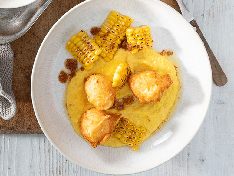 Maiskrapfen mit Mais-Creme und Röstzwiebelbutter