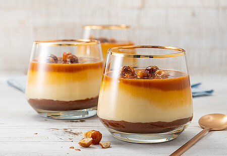2. Für die Schokomasse Haselnüsse, Kakao, Butter, 2 EL Karamellsauce und Salz fein pürieren. In die Gläser füllen und kalt stellen.