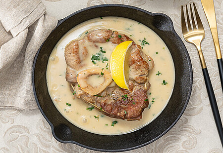 Fleisch herausnehmen, die Soße durch ein Sieb drücken und wieder in den Schmortopf geben. Sahne zugeben, kurz aufkochen und mit Soßenbinder abbinden. Mit Salz, Pfeffer und Zitronensaft würzen. Das Fleisch in der Soße warm halten und mit Petersilie bestreut servieren.