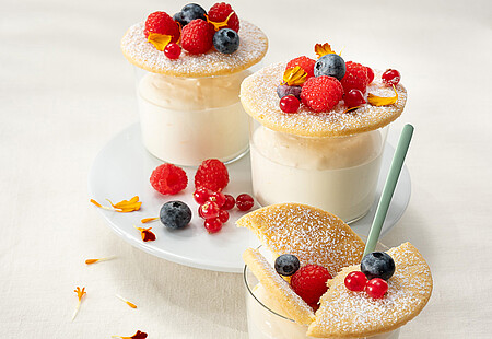 Auf die Gläser jeweils eine Teigscheibe als Deckel legen. Darauf ein paar Beeren platzieren und mit Puderzucker bestreuen.