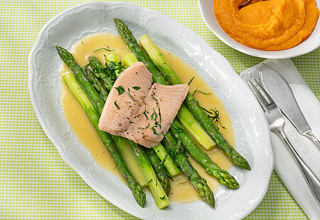 Spargel und Lachsforelle auf Butterschaumsauce mit Karotten-Ingwer-Püree