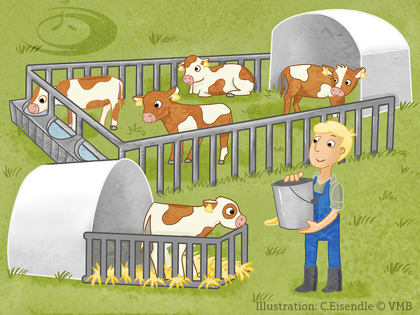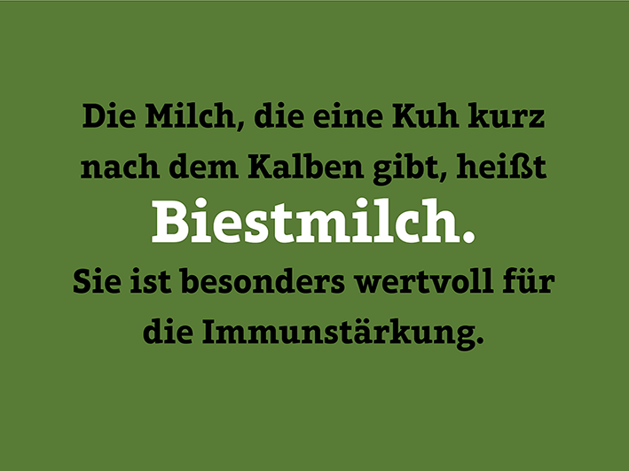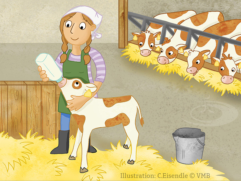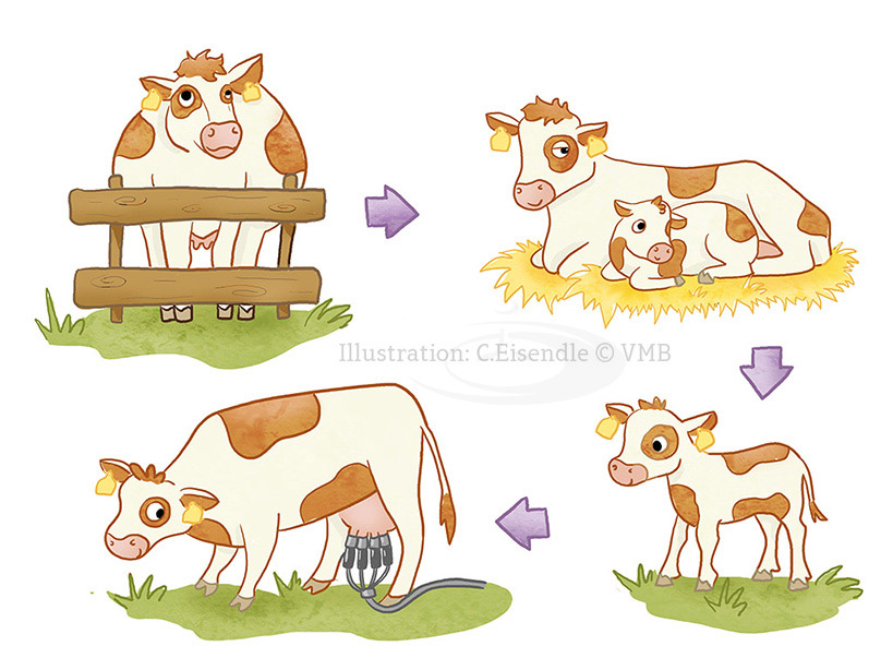 Nur ein weibliches Rind (= Kuh) kann Milch geben - und zwar dann, wenn sie ein Kalb geboren hat. Mit ungefähr 27 Monaten kann eine Kuh zum ersten Mal in ihrem Leben ein Kalb bekommen.