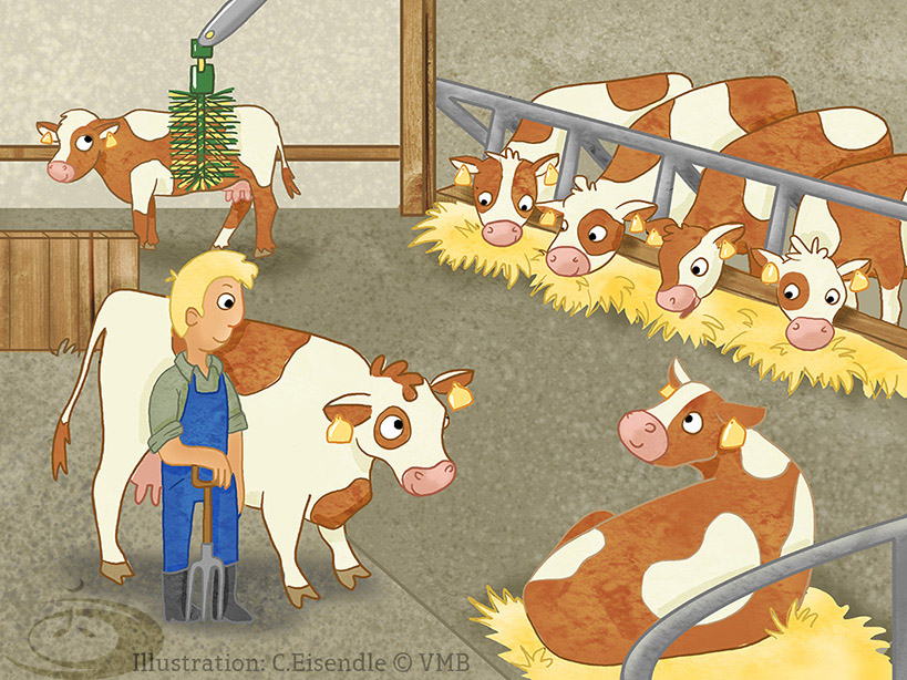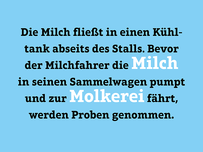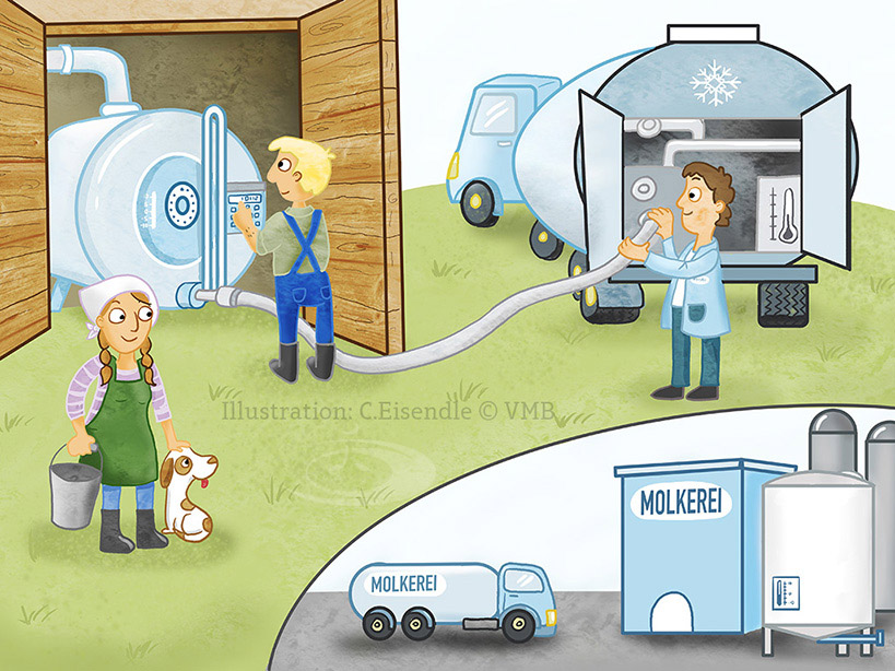 Die gemolkene Milch fließt in einen Kühltank, der abseits des Stalls steht. Täglich kommt ein Milchsammelwagen der Molkerei, der die Milch von Xavers Hof und weiteren Höfen abholt und zur Molkerei fährt. Bereits vor dem Abpumpen in den Sammelwagen werden Proben genommen, ob die Milch rein und ohne Rückstände ist. Währenddessen muss die Milch immer gekühlt werden.