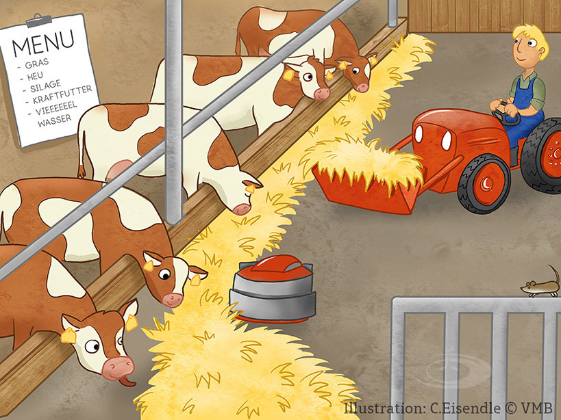 Kühe brauchen faserhaltige Nahurung wie z.B. Gras und Heu. Im Winter bekommen Kühe Silage (= haltbar gemachtes Futter) aus Gras und Mais. Zur optimalen Versorgung gibt der Bauer noch sogenanntes Kraftfutter dazu.