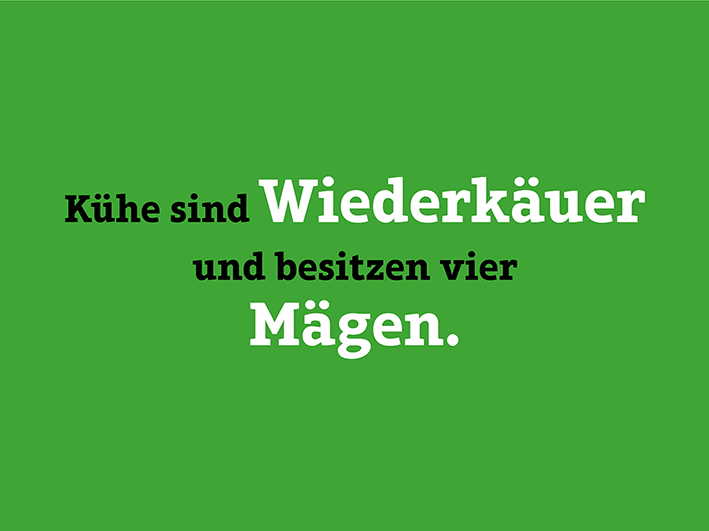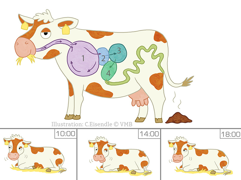 Kühe gehören wie Kamele, Schafe, Hirsche, Ziegen, Büffel, Elche usw. zu den Wiederkäuern. Das heißt, daß das grob zermahlene Futter zunächst geschluckt wird, kurz im Magen angedaut wird, wieder nach oben befördert und nochmals gekaut wird. Dann wird der Nahrungsbrei wieder geschluckt und zur weiteren Verdauung durch die weiteren Mägen befördert.
