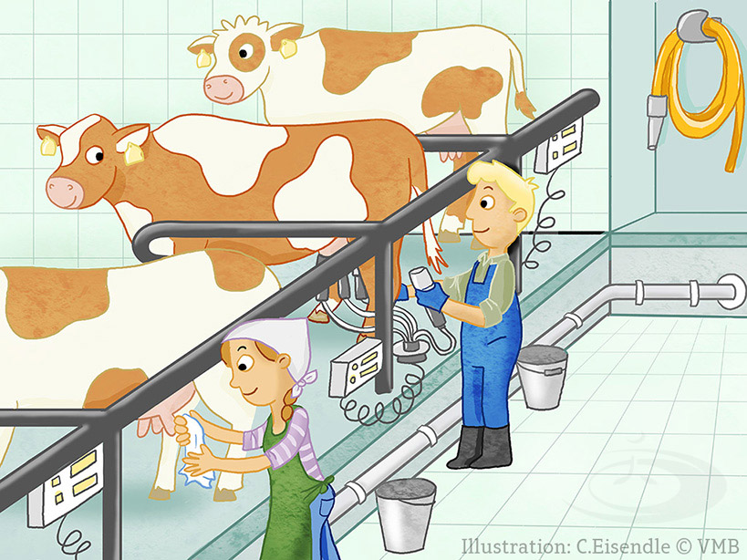 Xaver und Maria melken ihre Kühe nicht mehr von Hand wir früher - das erledigt eine Melkanlage. Maria säubert die Zitzen der Kuh, bevor sie ihr das sogenannte Melkgeschirr anlegt.