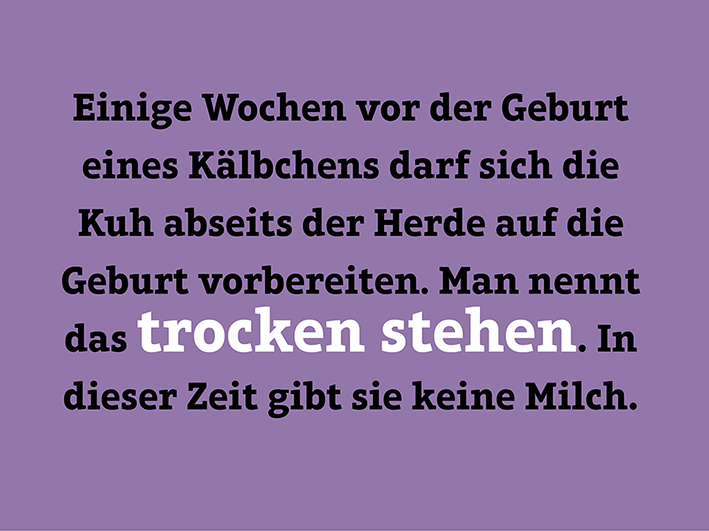 Einige Wochen vor dem Abkalben (= Geburt eines Kalbes) wird die trächtige Kuh abseits der Milchkuhherde auf die Weide gebracht. Man nennt das trocken stehen, denn in dieser Zeit gibt die Kuh keine Milch.