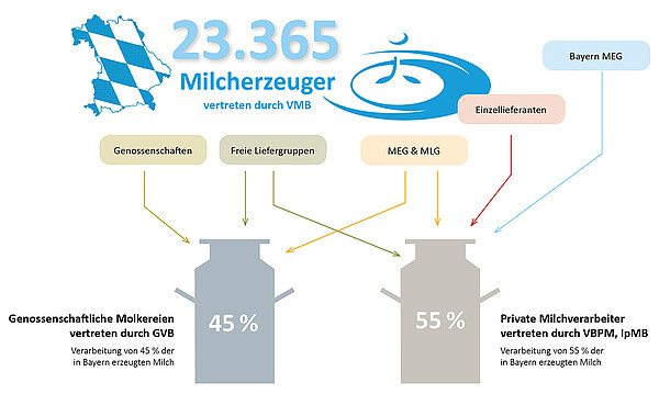 In Bayern sind in etwa die Hälfte der Milchbauern genossenschaftlich organisiert. Die andere Hälfte unterhält Vertragsbeziehungen zu privat geführten Molkereien. Auch in der Milchweiterverarbeitung sieht man die Vorteile der Genossenschaft. Der GVB beispielsweise vertritt die Interessen von 20 Molkereibetrieben.